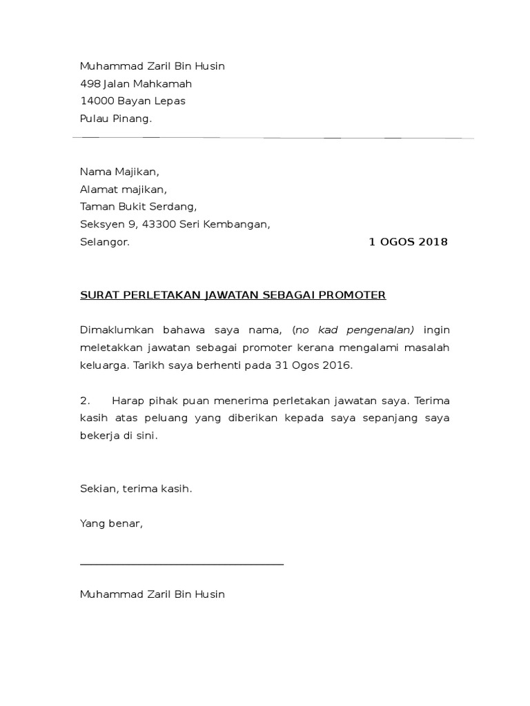 Surat perletakan jawatan contoh surat resign. Anda hanya boleh berkata Saya meletak jawatan atas sebab-sebab peribadi atau Saya meletak jawatan kerana masalah keluarga yang memerlukan semua masa saya Jika anda ingin pergi lebih terperinci sebagai contoh menjadi ibu bapa yang tinggal di. Sebagai pekerja syarikat anda biasanya berhak mendapat 14 hari cuti setiap tahun.